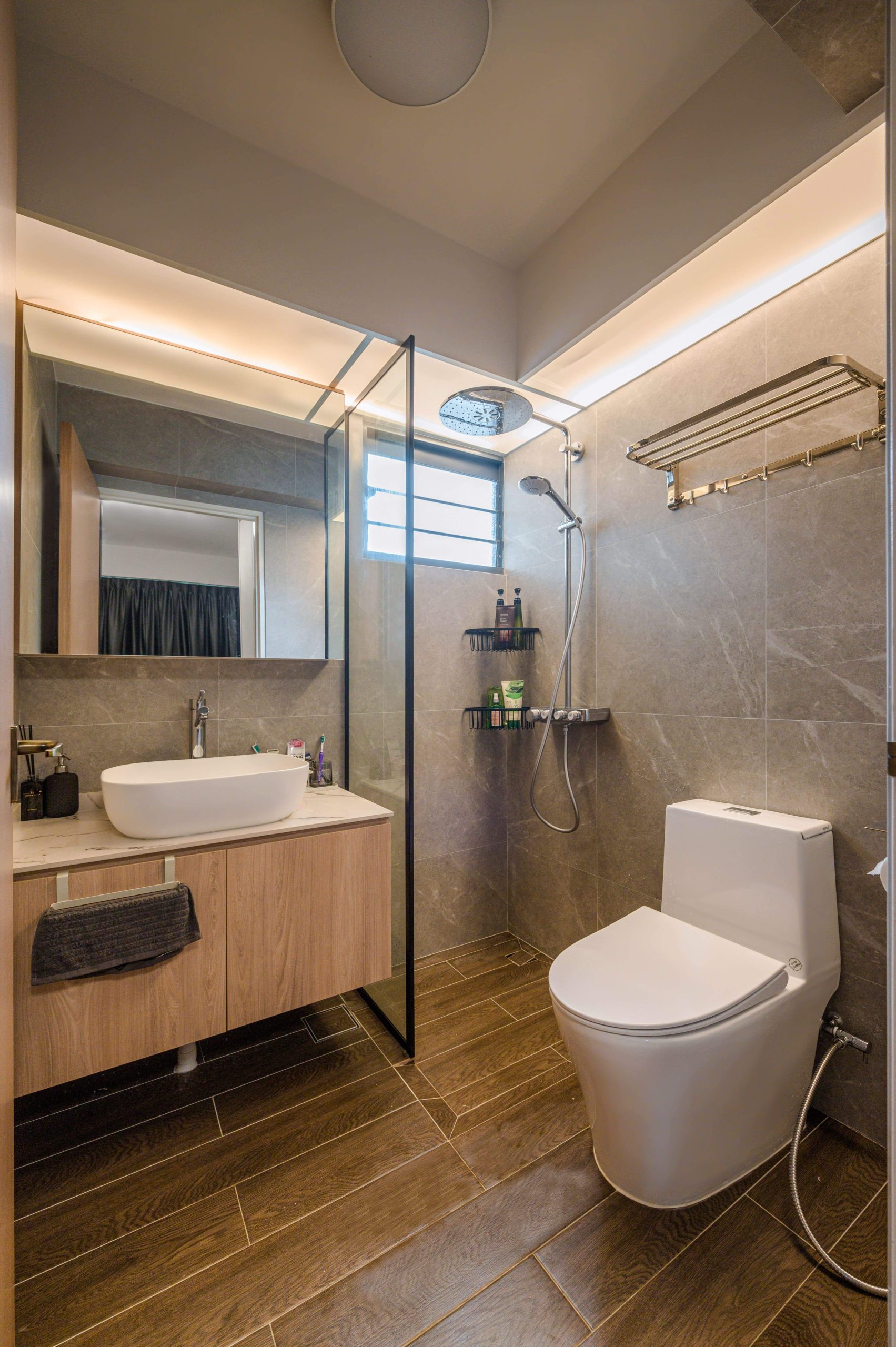 With a small floor plate typical of 3-room BTOs, the key challenge was to integrate social zones and storage without crowding the space. The kitchen layout was restrictive, and structural elements like the DB box and service yard wall broke visual continuity. The homeowners also wanted the home to feel light and spacious without using false ceilings.