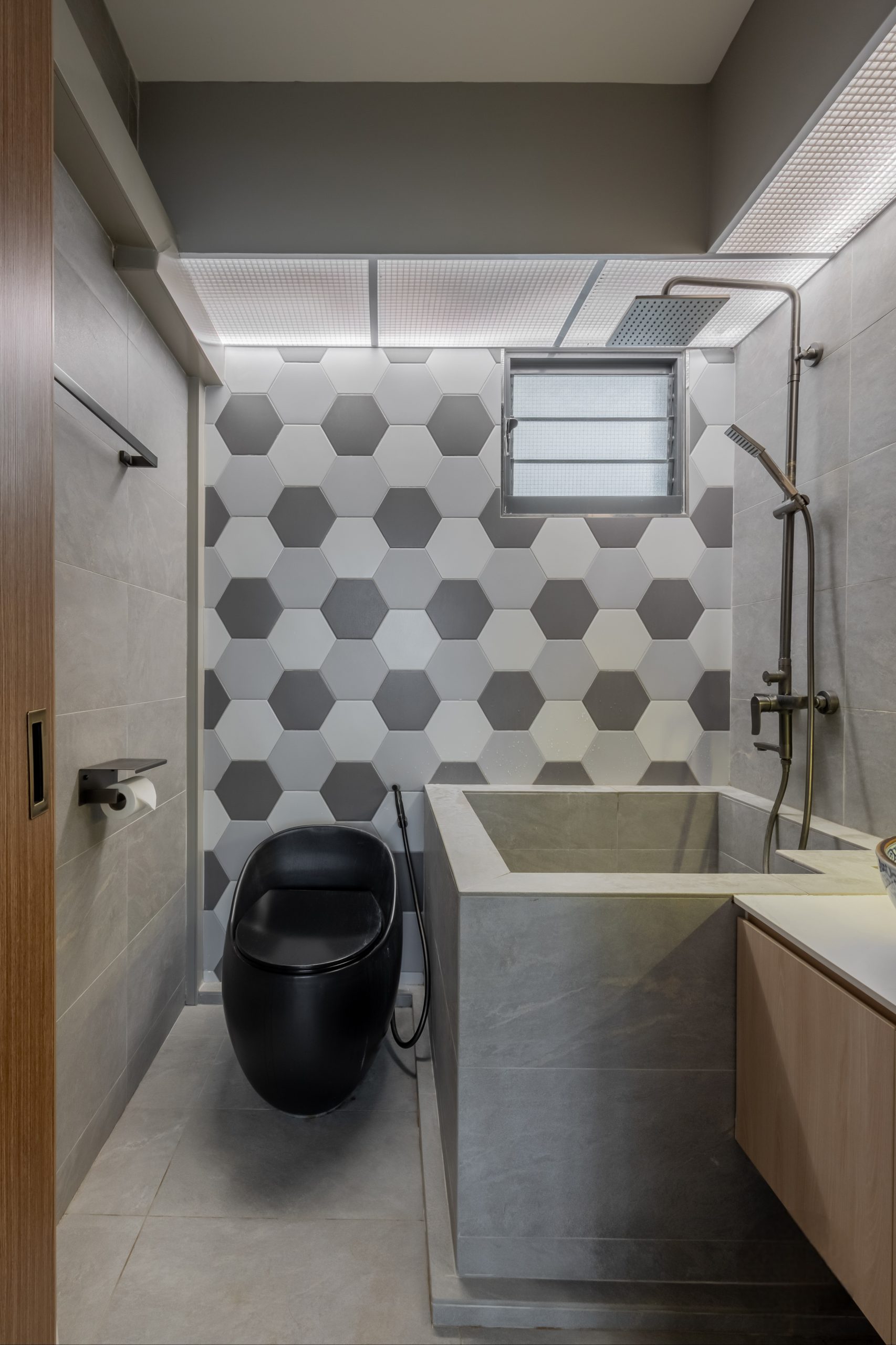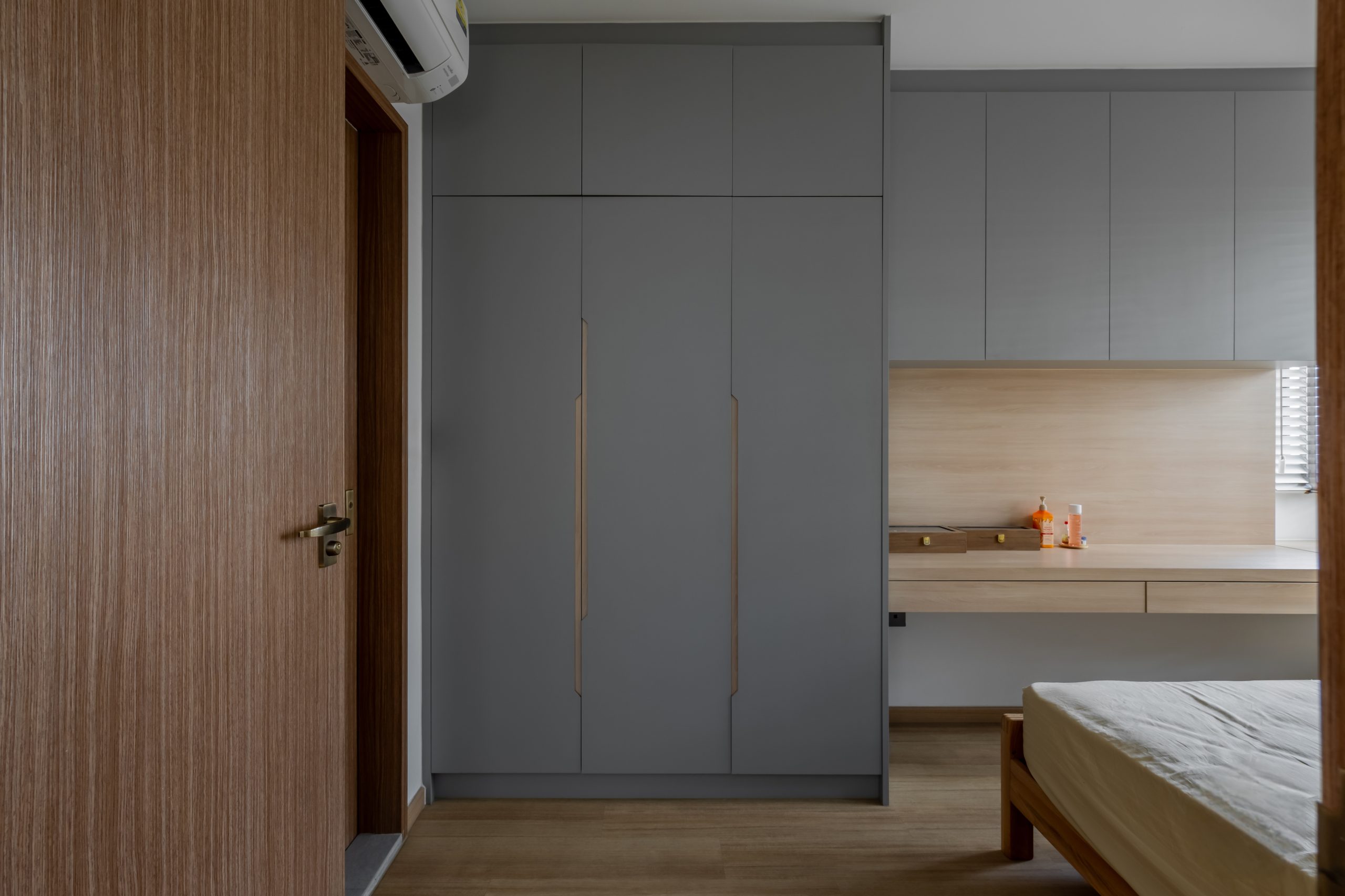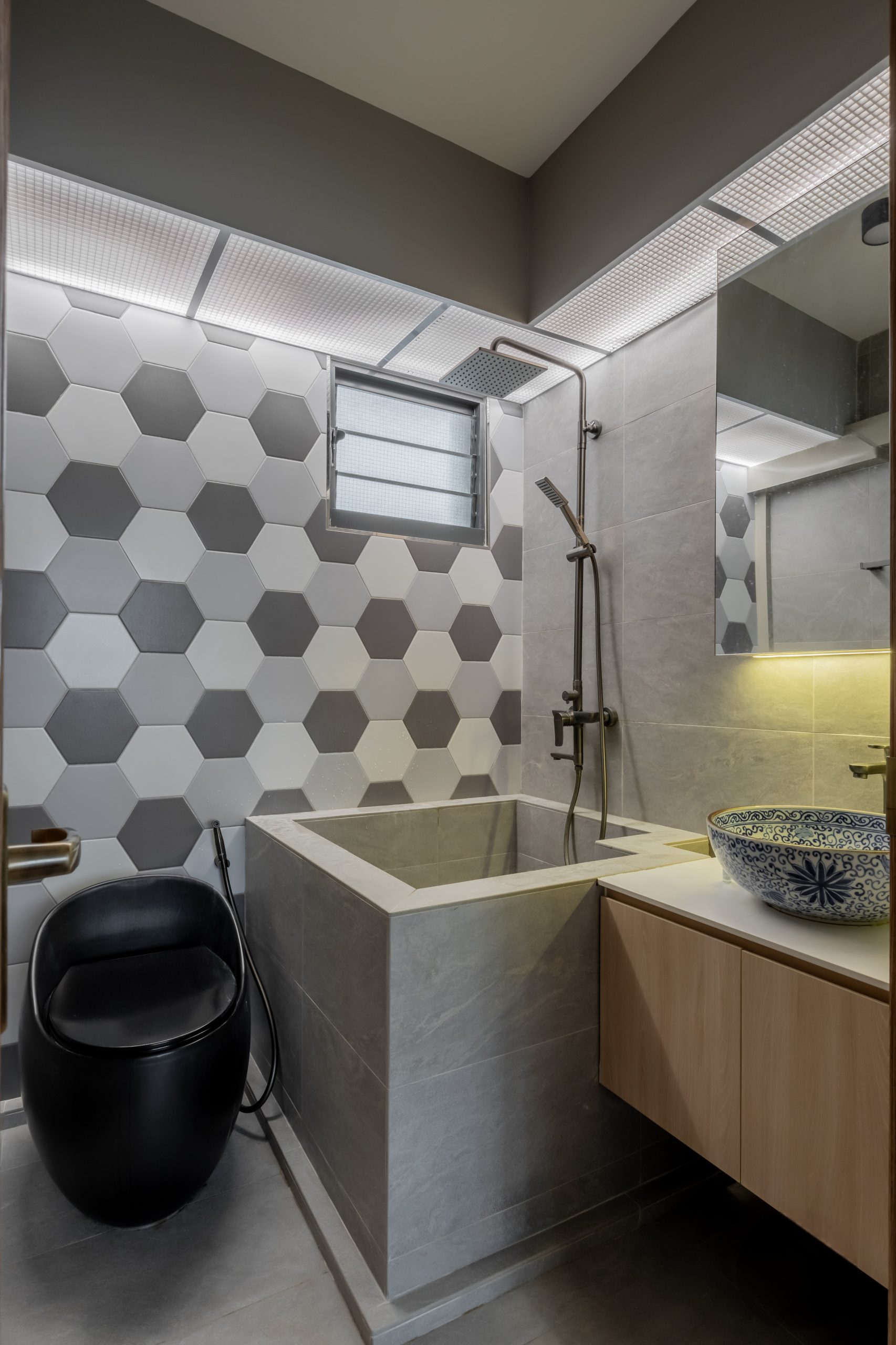 In the bathroom, the couple’s desire for relaxation led to the addition of an onsen-style tub. Instead of a one-tone space, we played with tiling to introduce texture and subtle contrast—staying true to the minimalist palette while adding visual interest.