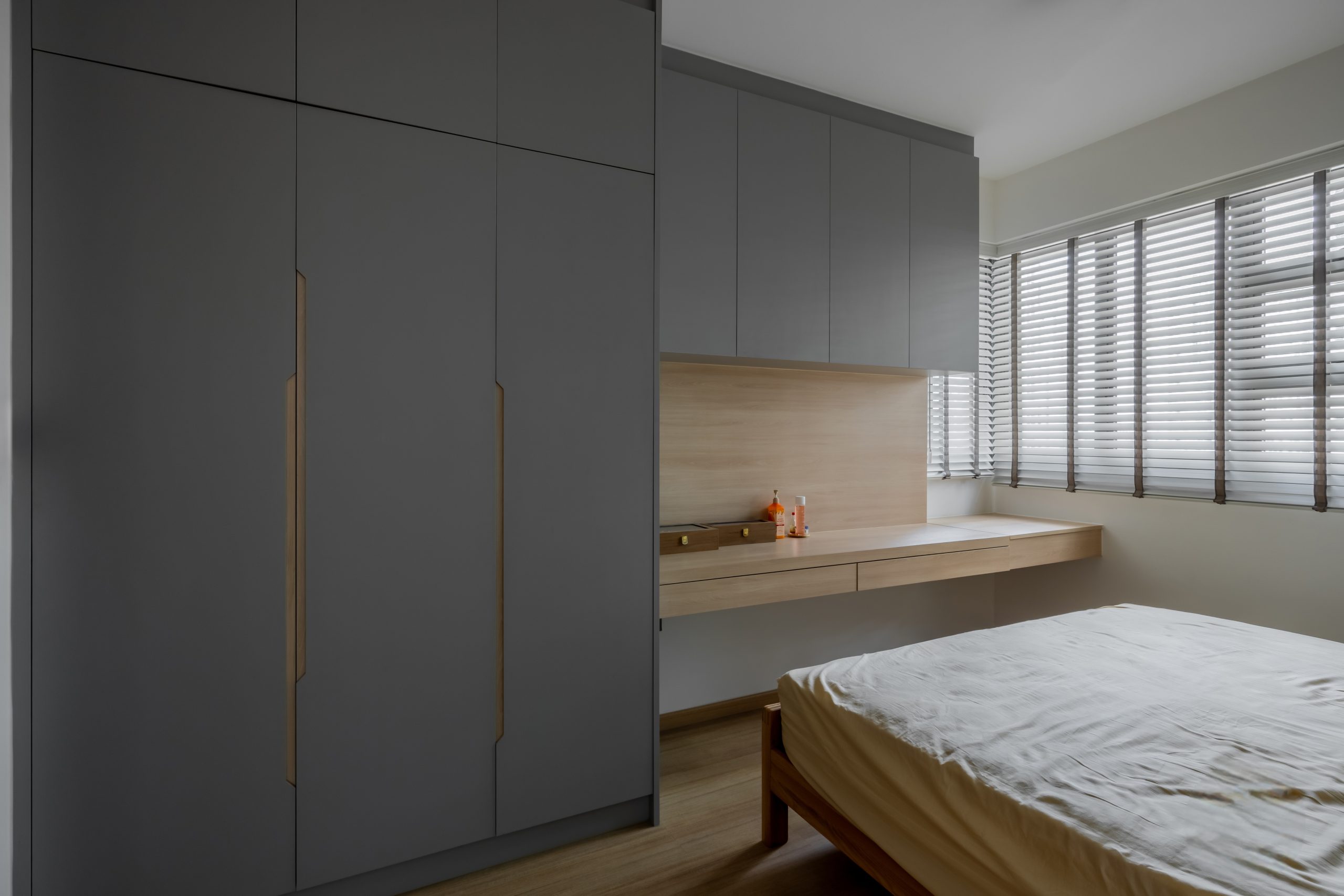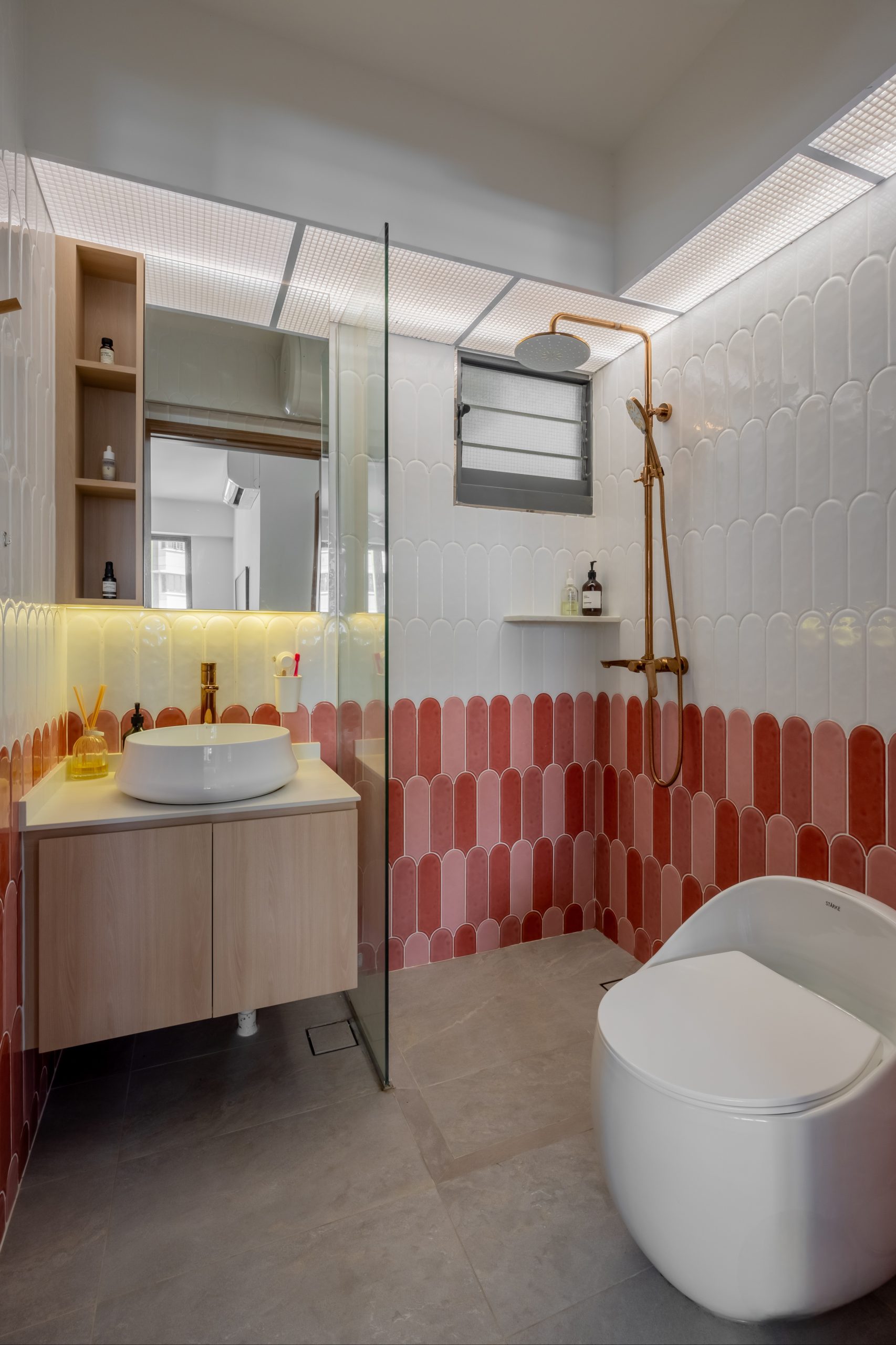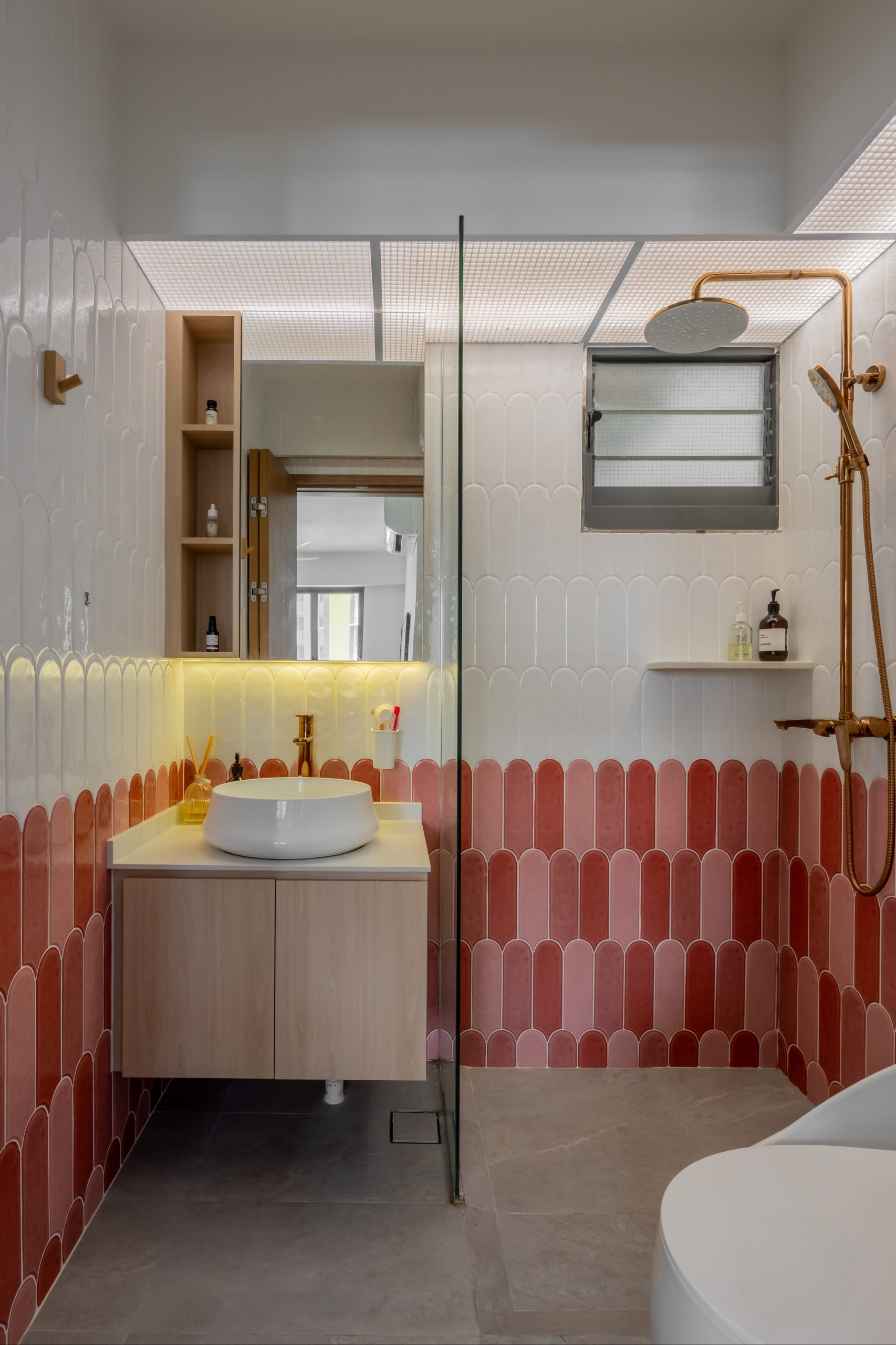 In the bathroom, the couple’s desire for relaxation led to the addition of an onsen-style tub. Instead of a one-tone space, we played with tiling to introduce texture and subtle contrast—staying true to the minimalist palette while adding visual interest.