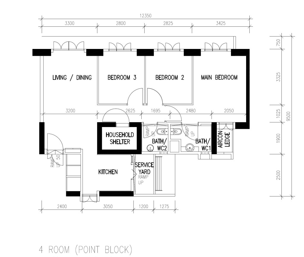 We hacked one of the bedrooms to open up the living and dining space, giving the common areas room to breathe. A large mirror panel was added to the bomb shelter wall to reflect light and visually expand the space without structural alteration.