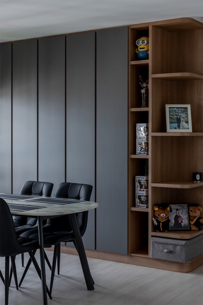A sleek shoe cabinet with a built-in bench anchors the entryway with both comfort and purpose, while the dining area was fitted with additional built-in storage—ideal for managing kids’ essentials discreetly.